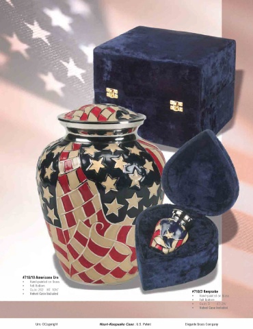 #718/10 Americana Urn Hand-painted on Brass Felt Bottom Cu.In: 202 HT: 10½" #718/3 Keepsake Velvet Case Included Hand-painted on rass Felt Bottom Cu.In: 3 HT: 21, Velvet Case Included Um: ©Copyright Heart-Keepsake Patent Elegante Brass Company